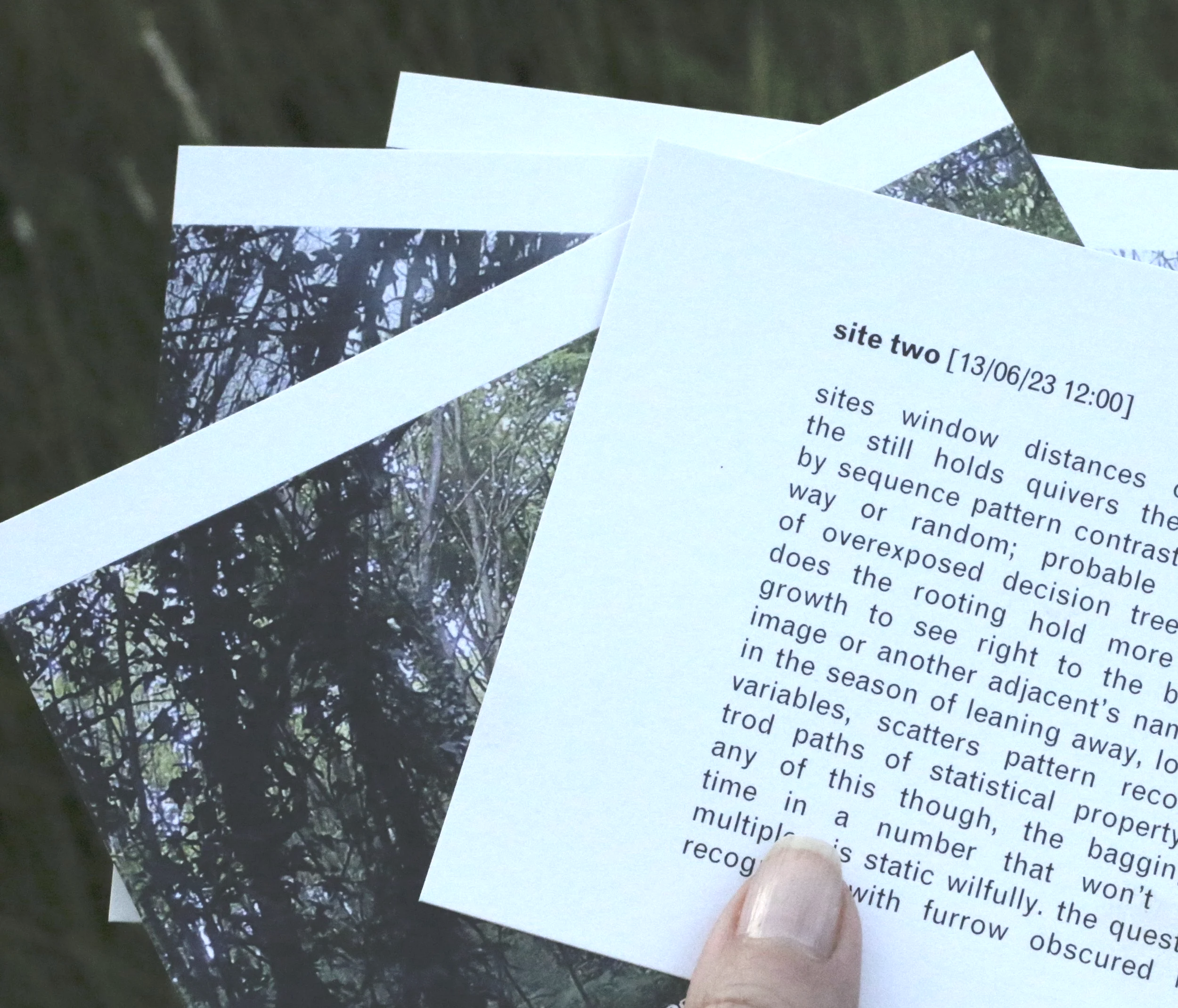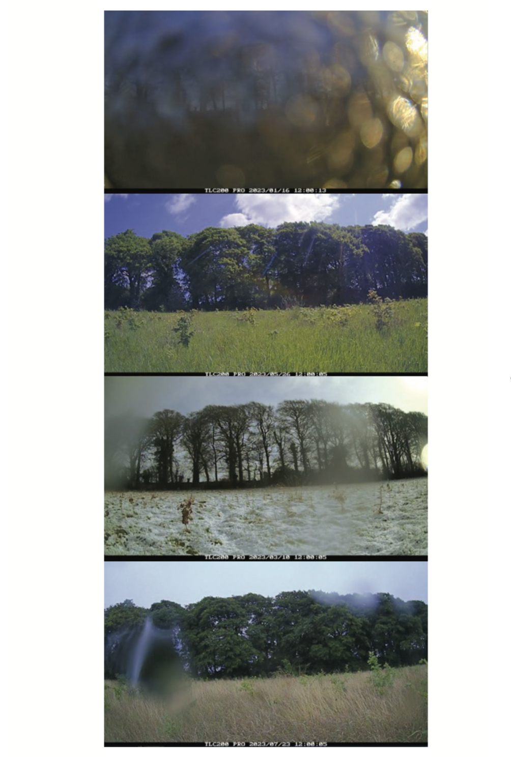 This interdisciplinary work emerges from poet Katy Lewis Hood’s responses to Martina O’Brien’s durational artwork of ephemeral measure. Between 2021 and 2023, O’Brien installed twelve digital cameras in different locations in Contae Chill Dara / County Kildare. Engaging with scientific practices of phenology (the observation of periodic/cyclical ecological processes) and the increasing use of technology to collect environmental data amid intensifying climate change, of ephemeral measure took a DIY approach to environmental sensing and monitoring. Katy Lewis Hood’s sequence of poems responds to O’Brien’s project through experimental poetic methods, attending to the glitches and poetic possibilities of digital mediation, colonial environmental histories in Ireland, and remote and embodied practices of environmental knowledge and care. The publication consists of: a prose-poem essay; a sequence of 15 poems by Katy Lewis Hood, interspersed with 13 gridded images from Martina O’Brien’s of ephemeral measure.