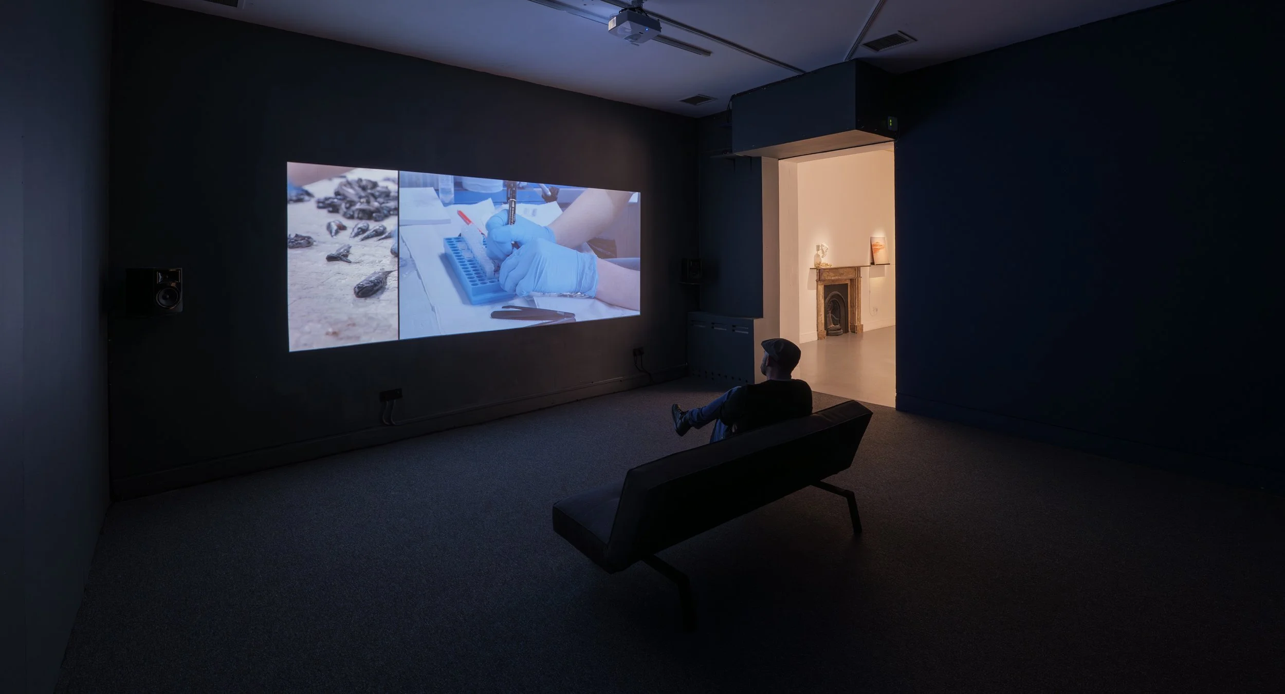 Filmed on location in the Atlantic Ocean aboard a research vessel, Daggertooth documents the mechanics, labour and materiality of contemporary fishing practices, including those taking place in scientific research. The video follows the intricate operations of a night fishing expedition which took place in the mesopelagic zone, also known as the twilight zone: a dark layer of water that stretches around the globe. Tracing how scientific knowledges are formed around these lives, Daggertooth lingers with the (im)mobilities of fish bodies and temporalities of violence as these creatures are caught up in global systems. Amid longstanding ocean protection efforts and changing international frameworks such as the Treaty of the High Seas adopted by the UN in 2023, the work considers the ocean as a space that remains fraught with widescale trawling practices, marine ecosystem damage and global depletion of fish populations, and questions patterns that continue to instrumentalise nonhuman lives.